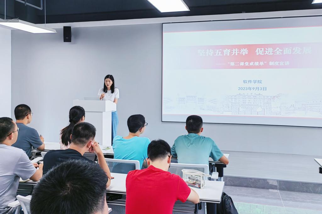 9月3日下午,yl6809永利官网在翡翠湖校区科教楼B501开展“坚持五育并举 促进全面发展”第二课堂成绩单宣讲,学院学生工作办公室主任兼团委书记郑华担任主讲人,2023级全体新生参加。