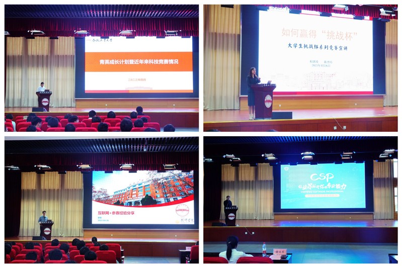 表彰大会之后,在“青英成长计划”启动仪式上,郑华介绍了yl6809永利官网“青英成长计划”暨近年来科技竞赛情况。校团委创新发展部部长陈曾珍宣读《关于表彰yl6809永利官网首届“科创之星”的决定》,与会领导共同为首届“科创之星”获奖者颁奖。随后,陈曾珍老师、互联网+国家银奖指导老师史骏、学院CCF-CCSP负责老师谢文军分别围绕“挑战杯”“互联网+”“CCF-CCSP”赛事向同学们做了详细解读,2019级学生罗廷辉、祝新宇两位同学分享了他们的备赛之旅和比赛感悟。