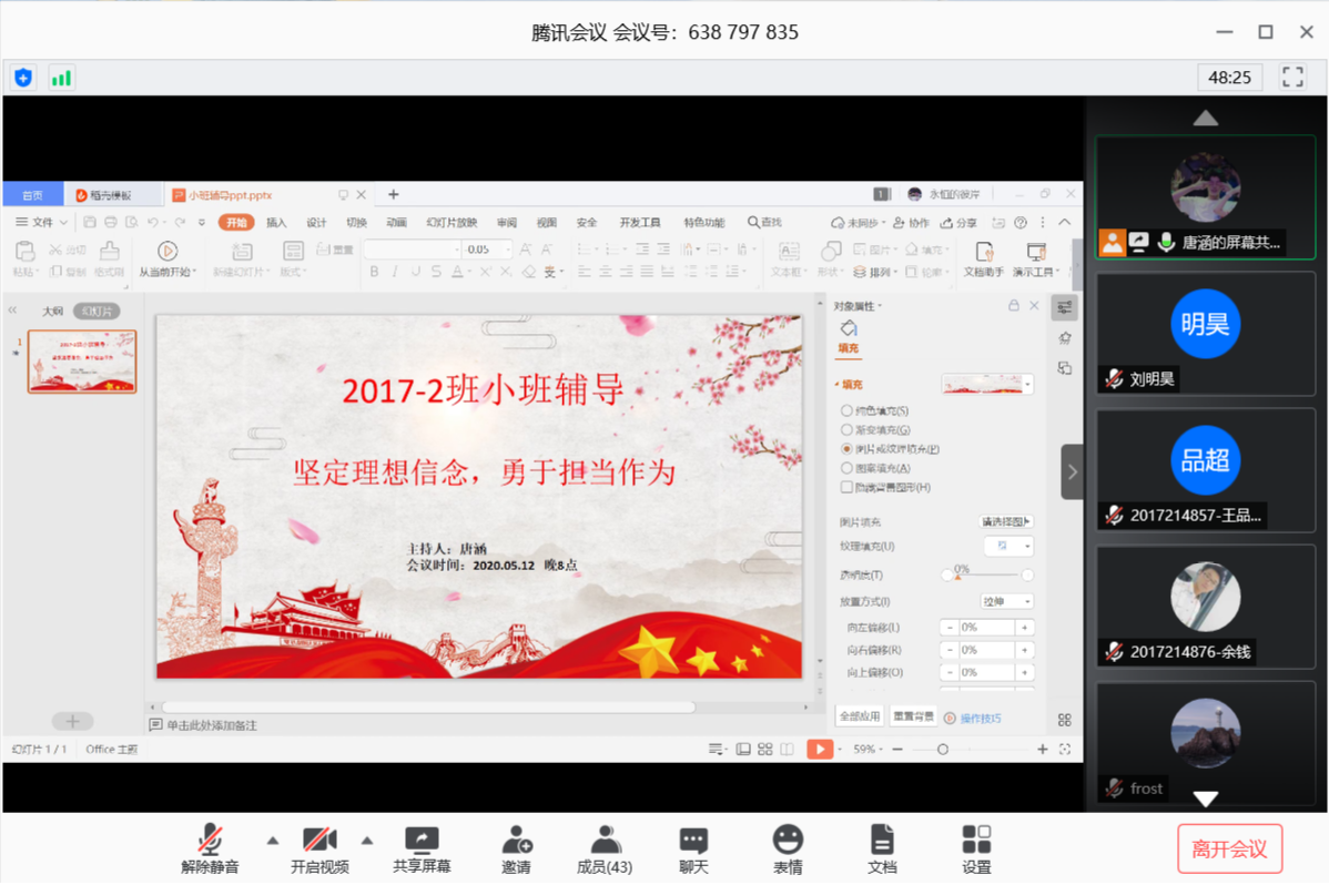 5月12日晚上,软件17-2班使用腾讯会议软件召开了线上小班辅导,主题是“坚定理想信念,勇于担当作为”。本次小班辅导由唐涵同学主持,袁杨华老师和软件17-2班的全体同学参加了小班辅导。