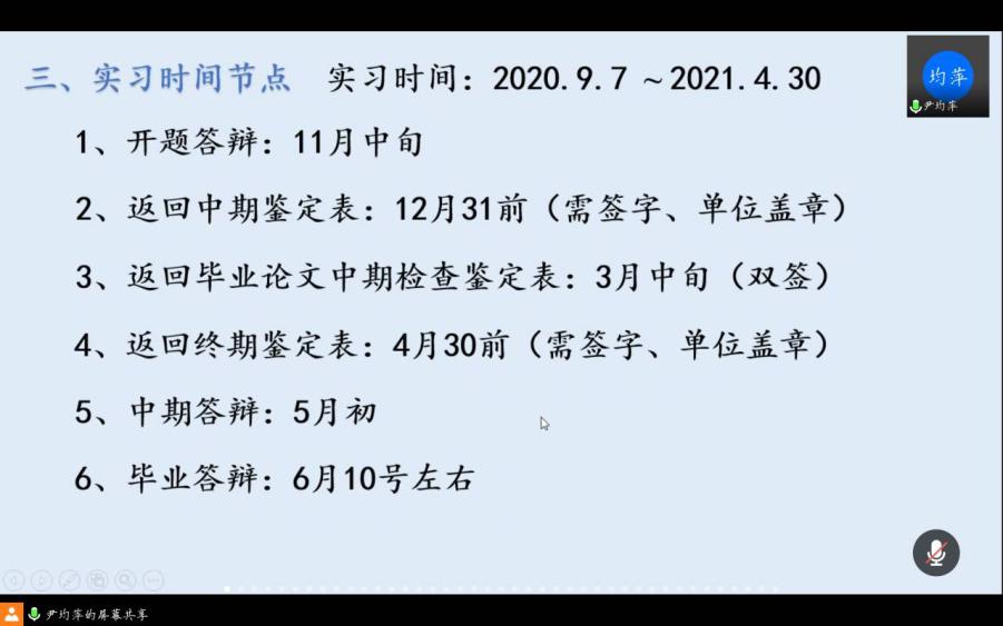 张炳武老师对企业实习做动员,对企业实习实训环节的重要性、实习单位的选择、实习期间的安全、纪律等做了强调和要求;随后,尹均萍老师就企业实习和毕业设计的流程和时间节点、毕业设计的课题要求、企业实习的有关管理规定等做了详细的介绍。最后是学生提问环节,尹老师就学生关心的实习期间考研请假、自找实习单位的规定和流程、改换实习单位以及选毕业设计指导老师等问题一一进行解答。