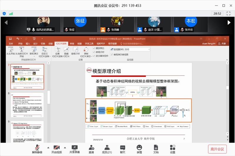本次中期检查答辩共分成九组,每组分别建有答辩QQ群,并设有教师和学生的答辩组长,便于学生和老师的联系和答辩通知安排等。此次线上答辩采用腾讯会议或QQ视频电话直播平台,利用屏幕共享,每个学生按照事先规定的顺序依次进行线上PPT展示,主要从目前已完成的工作、程序演示、遇到的问题与下一步的计划和翻译内容等方面进行汇报。然后答辩评委老师针对学生汇报的内容进行提问。答辩结束后,每组答辩委员会根据学生的答辩表现和问题回答情况综合给出中期检查成绩。整个答辩过程要求学生打开摄像头,更好地增加师生间的互动,所有小组的中期检查答辩顺利地完成。