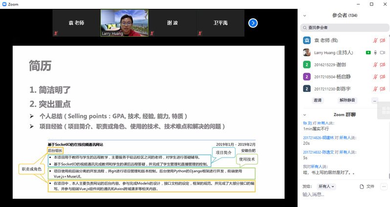本次线上讲座使同学们了解到真实的求职过程,强化了大家对求职的认知,鼓励同学们能在疫情中以更加积极乐观的态度和进取的精神寻找合适的实习和就业机会,并有足够的信心应对因“疫情”导致的困难。