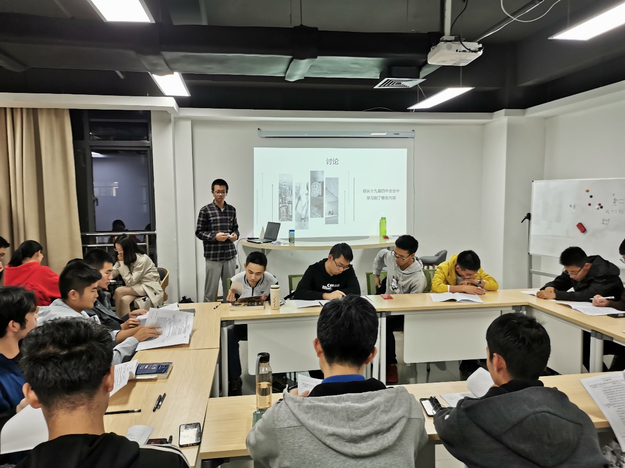 讨论会上,19-2班李激扬同学带领同学们回顾了党的第十九届四中全会会议精神,强调了中国特色社会主义具有的13方面的显著优势,并列举了坚持党的领导等13项制度体系。在谈及同学们的当前任务时,主持人通过近期在多个场合召开的“不忘初心、牢记使命”主题教育,用党的初心与使命鼓励我们砥砺成长,担当使命。