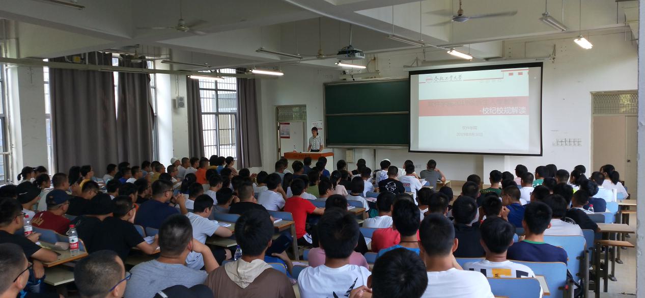 8月30日下午,yl6809永利官网团委书记袁杨华老师和辅导员朱子琪老师在翡翠湖校区三教201教室给全体2019级新生作校规校纪教育,介绍了校规校纪、考试中的一些注意事项、违纪的处罚等,对学校系列资助政策进行了讲解,为同学们在学习生活中的常见问题进行了详尽解答。