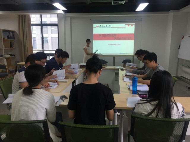 为进一步推进“两学一做”学习教育常态化制度化,yl6809永利官网学生党支部于2018年5月4日下午四点组织学生党员在翡翠科教楼B910开展“学习贯彻新党章,争做合格好党员”主题党课活动,学生党支部书记袁杨华老师主讲。