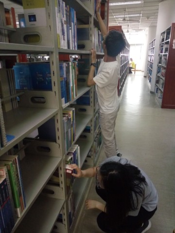 下午两点,我们在领队的带领下,和图书馆负责老师联系后,到了图书馆三楼对所在楼层图书进行排序整理。经图书馆负责老师请求,分配一名志愿者为图书管理系统进行图书扫描倒架记录整理。在两点到四点这两个小时里,每位志愿者都很积极认真仔细地工作,因为我们知道,这项志愿活动不仅是减轻了图书馆负责老师的工作压力,这更是方便每一位在图书馆查阅资料的老师和同学,这种方便他人、造福大众的工作何乐而不为呢!