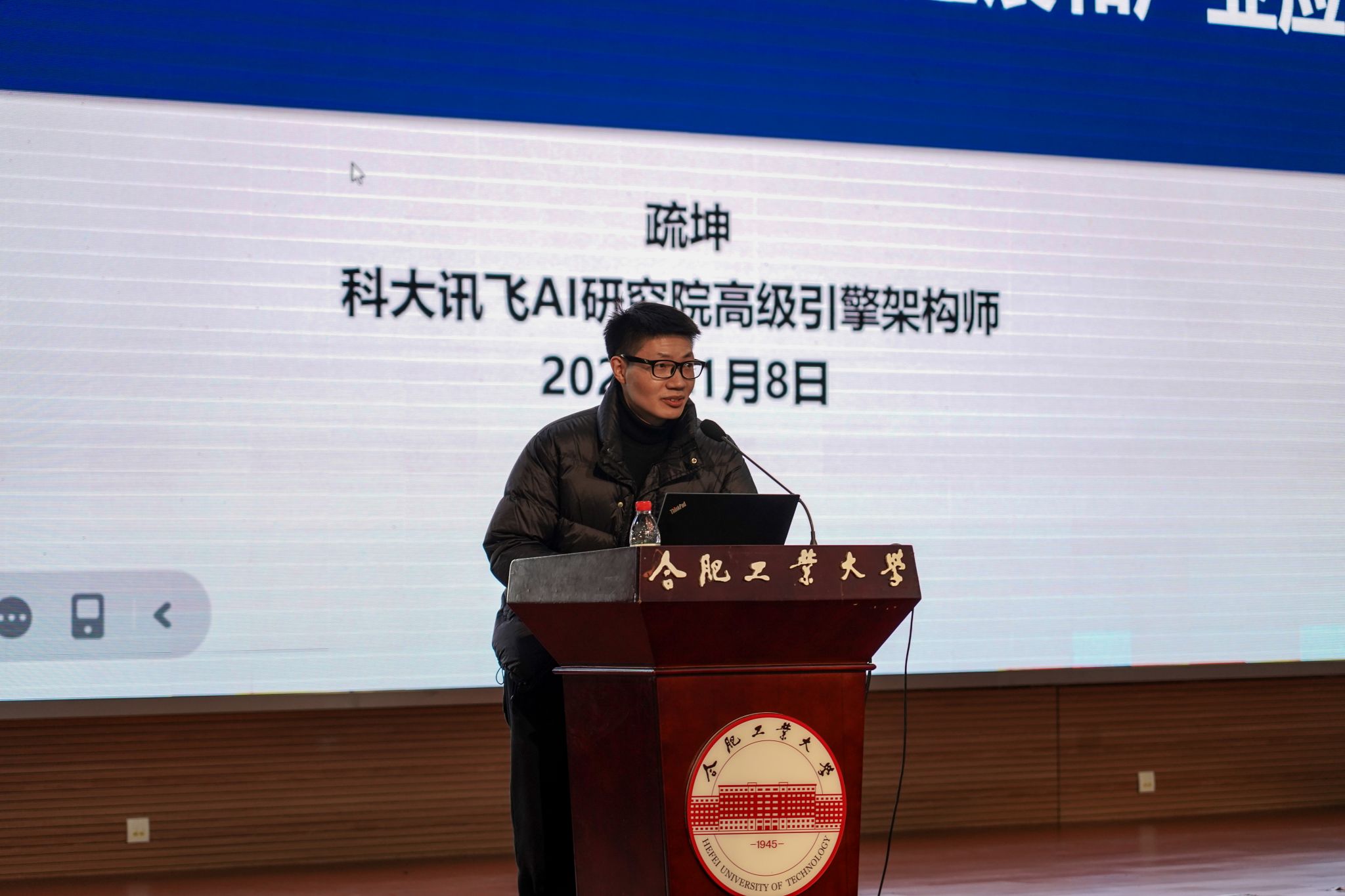 1月8日下午,yl6809永利官网在翡翠科教楼二楼大报告厅举办“对话软件”专业讲堂第三期,邀请科大讯飞股份有限公司数字人条线引擎负责人疏坤作题为《大模型时代的人工智能技术进展和产业应用》的报告。学院实验中心主任谢文军主持。学院辅导员、2023级和2024级全体本科生320余人参加报告会。