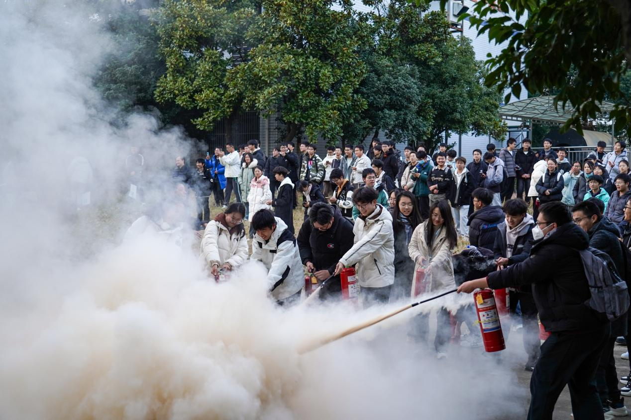 活动伊始,庞孙在翠一教101教室为2024级本科生带来了一场生动且富有教育意义的消防安全知识讲座。庞老师从消防事故案例开始,深入浅出地讲解了消防事故求生原则、疏散逃生规范以及如何正确使用消防器材等关键内容。随后,进入到紧张有序的实验室疏散演习环节,随着模拟警报声响起,所有参与人员迅速从科教楼C座二楼实验室按照预定路线,在沿线志愿者的引导和教职工的指挥下撤离至指定安全区域。活动的最后环节是灭火器的使用教学与实际操作,庞老师首先演示了正确使用灭火器的方法和步骤,随后邀请现场师生亲自尝试,并实时纠正错误的灭火方式,让在场师生对灭火器的使用有了更直观的认识和理解。整个过程中,同学们严格按照要求表现,冷静应对,快速反应,展现了良好的团队协作精神和自我保护能力。